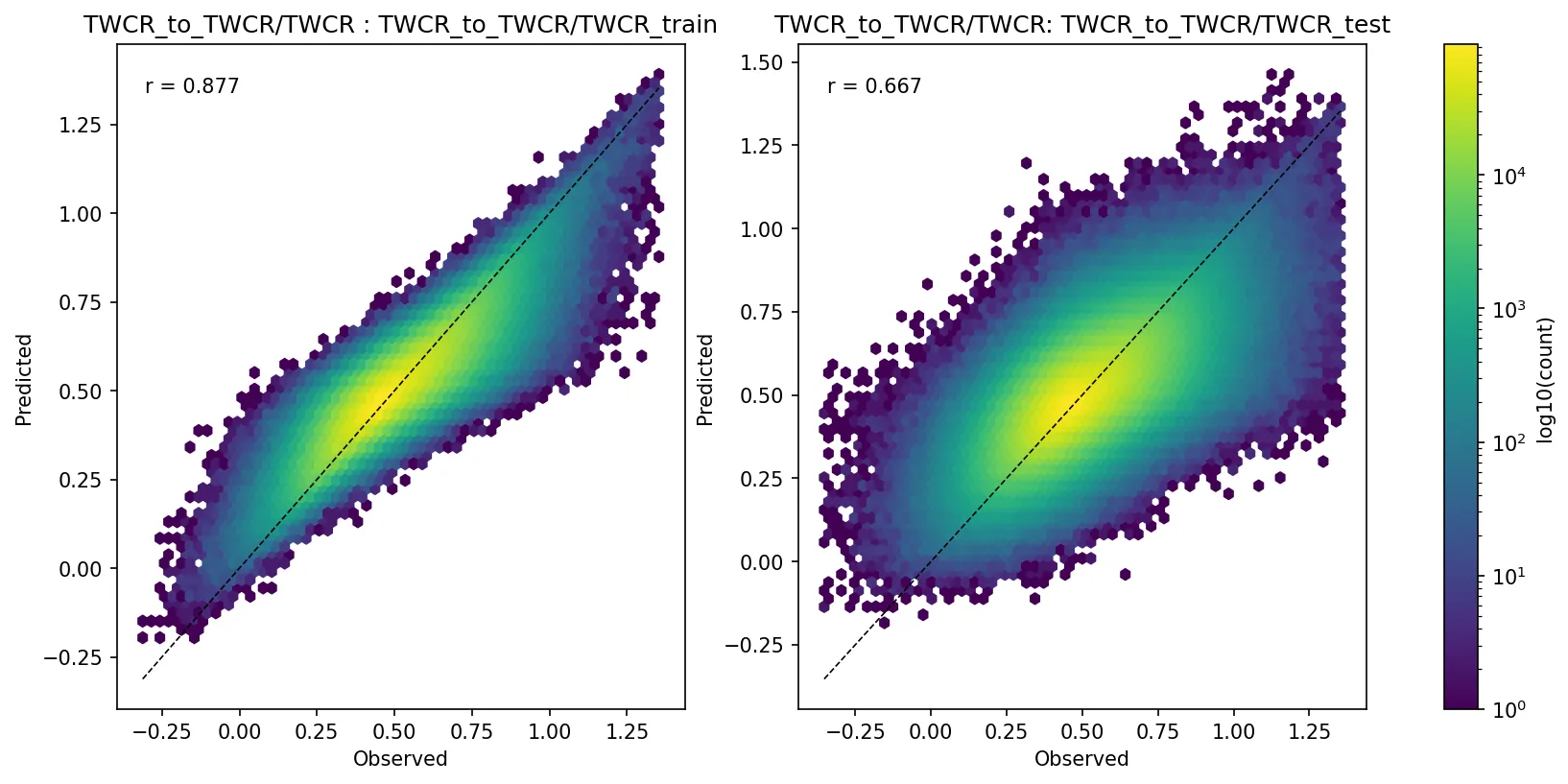 Validation plots for an XGBoost model trained to predict precipitation from a set of surface variables (temperature, humidity, pressure, latitude, longitude, calendar month). Left scatter plot shows performance on the training dataset, right scatter plot shows performance on the test dataset. (Figure source).¶